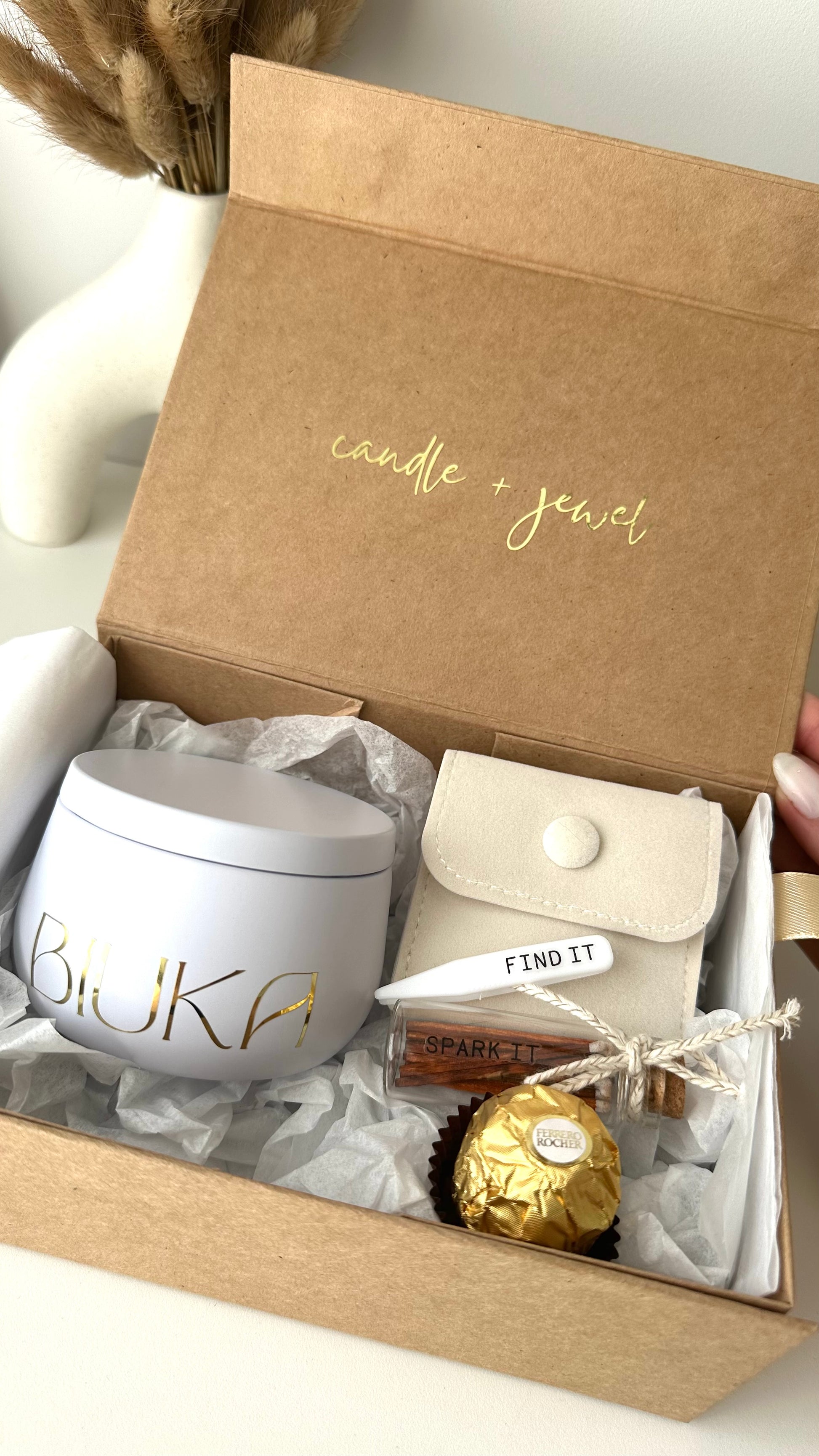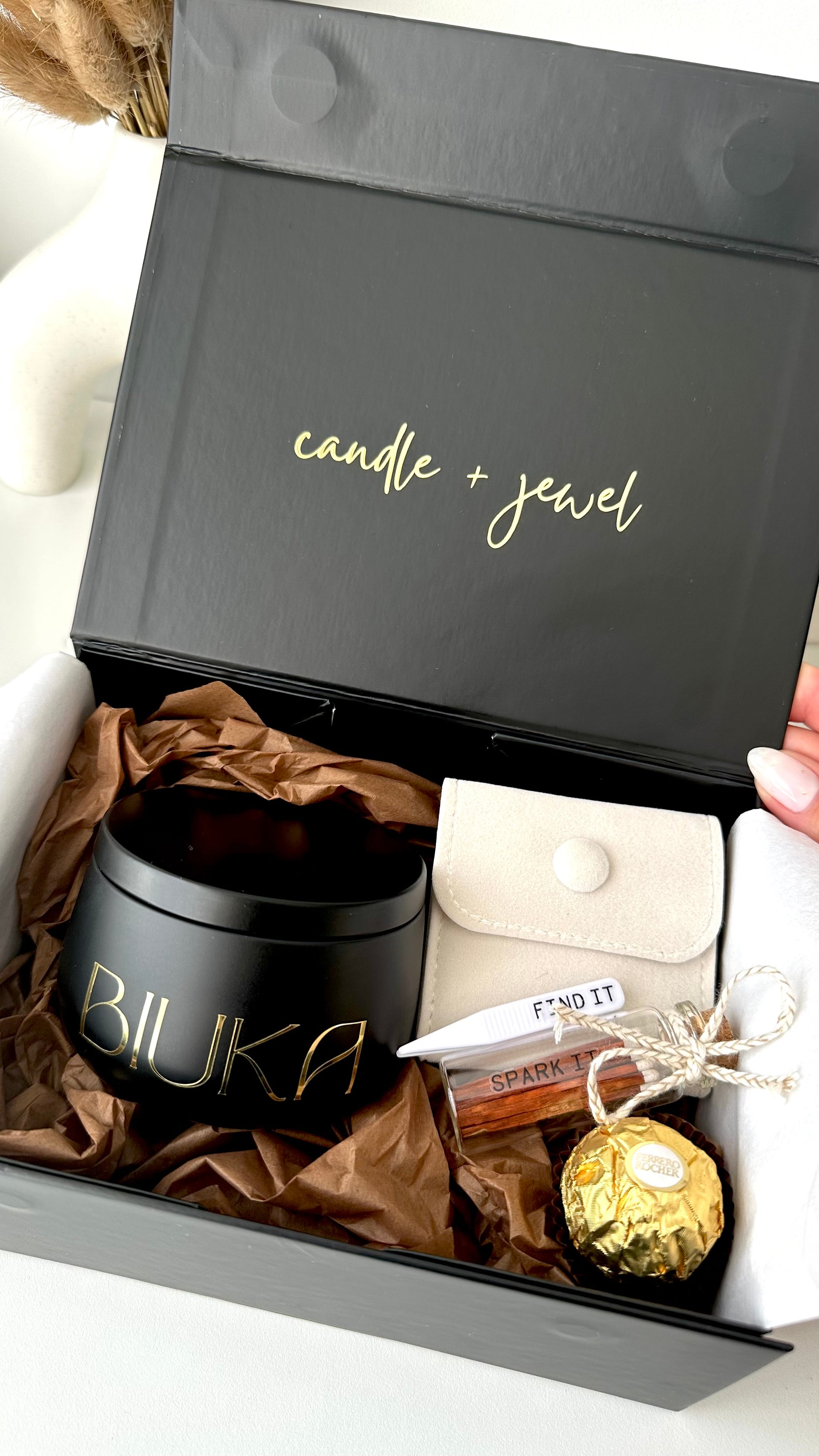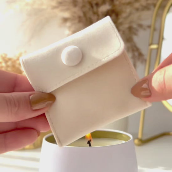 The experience begins with our handcrafted packaging, brimming with elegance and meticulous details designed to delight from the very first moment. The quality continues inside when the hand-sealed lid is lifted. Inside, you’ll discover the candle with its hidden jewel of 925 Sterling Silver quality, a mini bottle of stylish matches, a tweezer to easily remove the heat bag containing your jewel from the melted wax, a piece of fine chocolate, and a mini velvet bag to keep your jewel safe.
