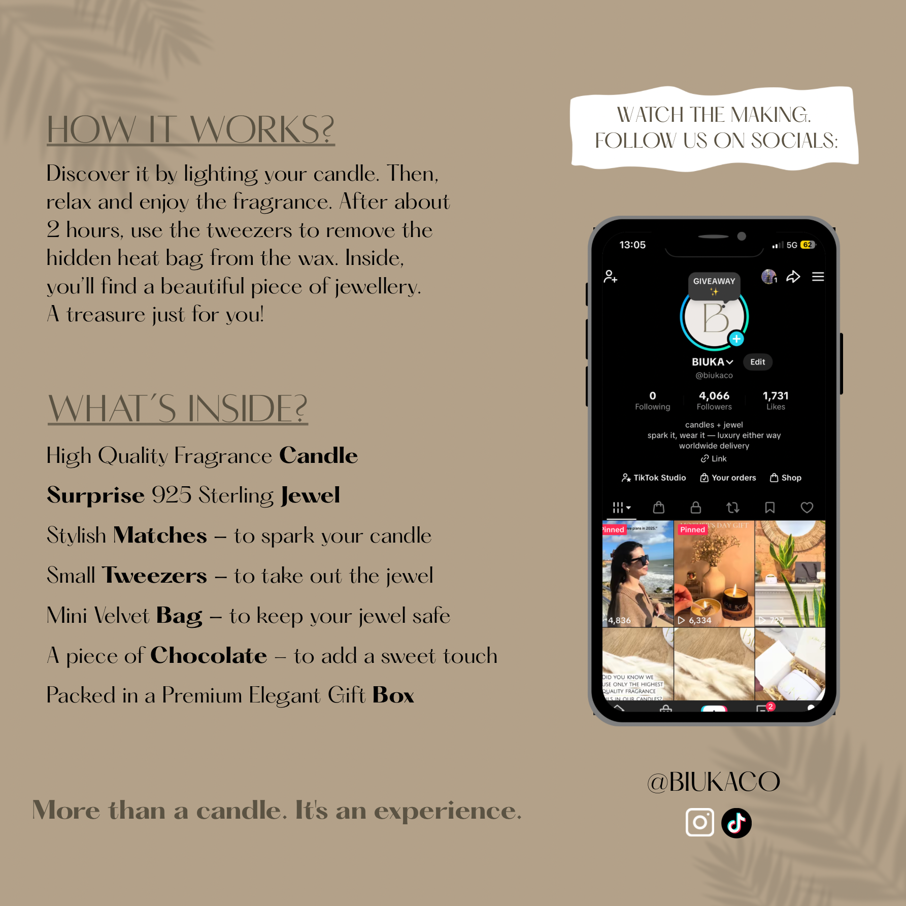 Inside, you’ll discover our high-quality handmade candle with a piece of 925 sterling silver jewellery sealed inside a heat-resistant bag. The most anticipated moment!